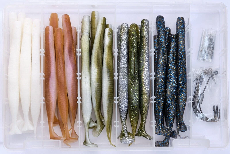 A selection of these brilliant lures including Pintail, Pulsetail & Paddletail pattern worms, two of each colour in the range. Coming with everything you could possibly need including a range of weedless hook options, rattles you can add to your lure and weighted tungsten spikes so you can tweak and adjust as you see fit. All supplied in its own clear plastic clip down lure box. Â Â