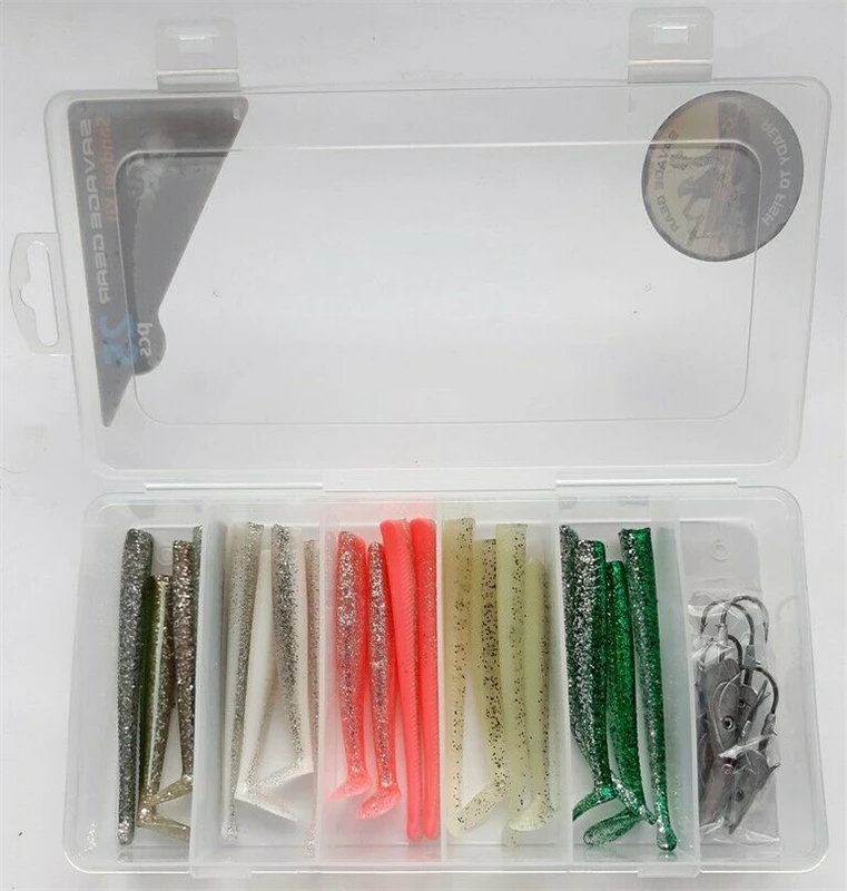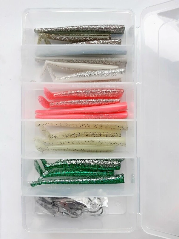 A selection of slug and paddletail soft plastic imitations, with five different colour choices so you can ring the changes and keep catching.