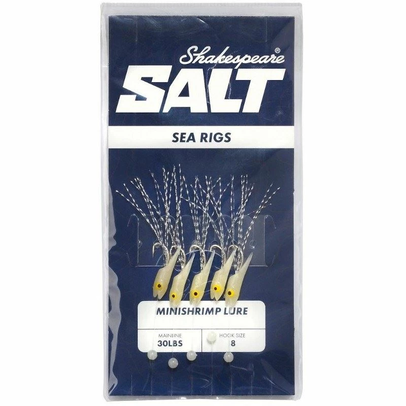 A five hook rig pattern with each hook featuring a small plastic body, painted eye plus tinsel teaser. Ideal for catching a range of smaller baitfish from boat or shore.